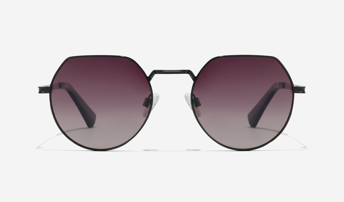 Sofisticado y elegante, este diseño asimétrico de gafas de sol en acero inoxidable en negro brillante, terminales negros pulidos y lentes color vino.
