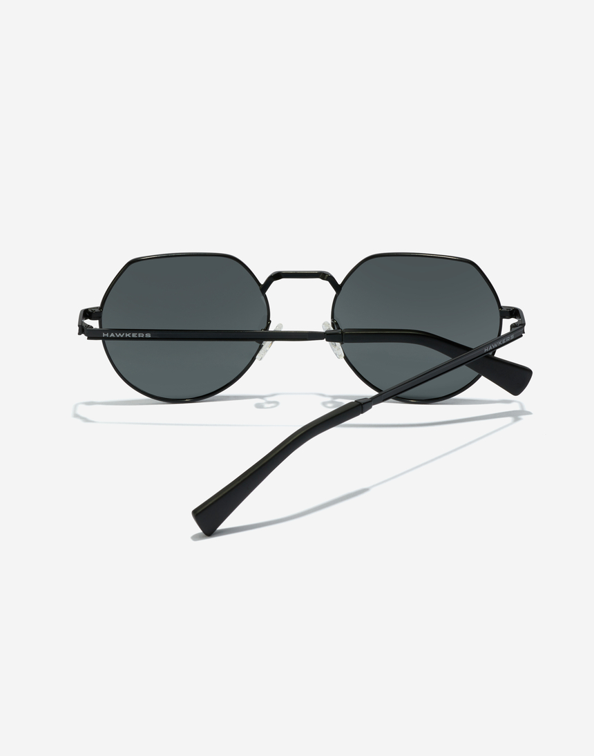 Pura irreverencia. Un diseño de gafas de sol totalmente negras en acero inoxidable con puente angular estriado. El acabado mate de la montura y el diseño de sus patillas y terminales se complementan con las inusuales lentes semiredondeadas.