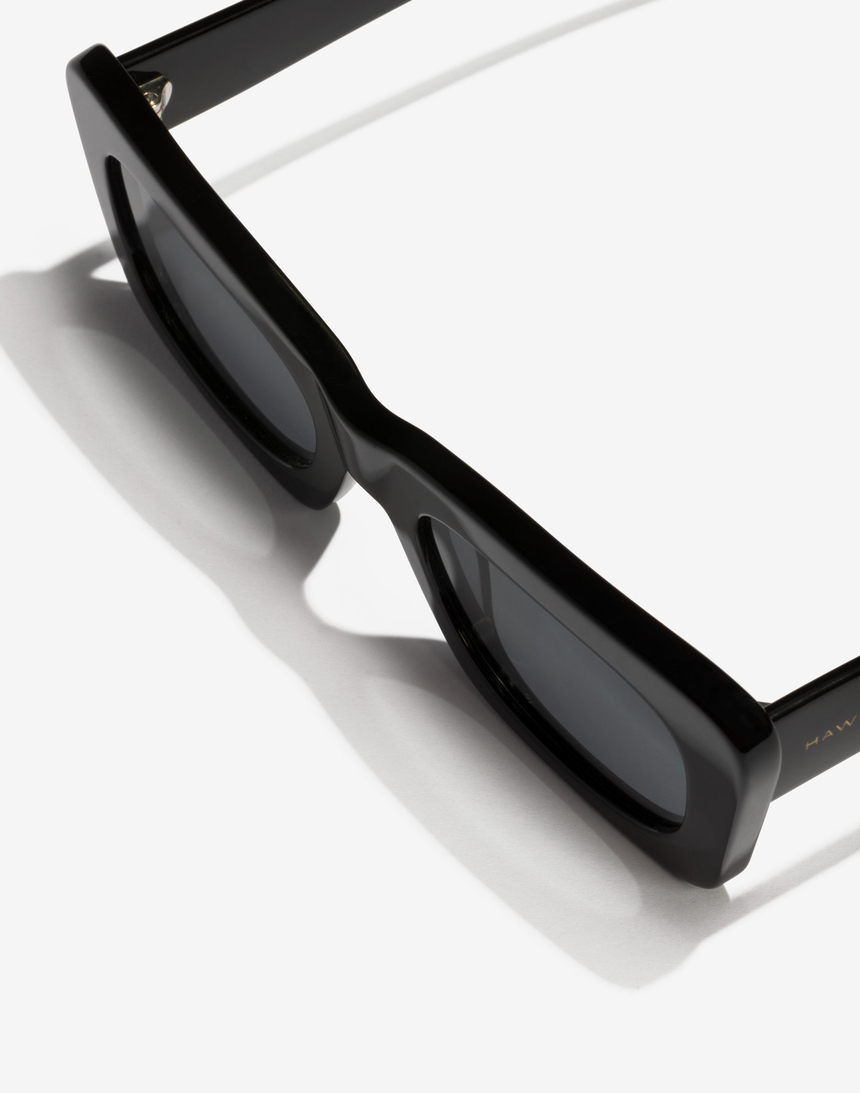 Gafas de sol para hombre y mujer inspiradas en los ‘90. Montura rectangular color negro en acabado brillante y marco grueso fabricada con el prestigioso acetato de Mazzucchelli. Este modelo con lentes negras ofrece protección 100% UV400.