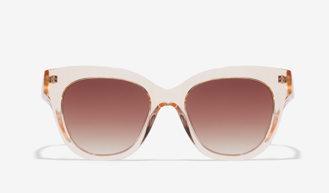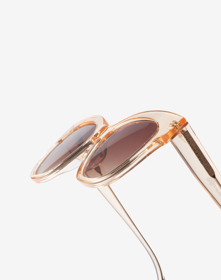 Gafas de sol Hawkers estilo mariposa que recuperan las líneas sofisticadas y femeninas de los años 70. Montura transparente en color champán con lentes marrones degradas categoría 3 y protección UV400.