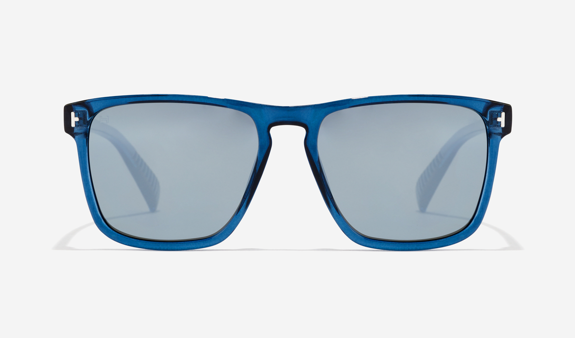 Gafas de sol de forma rectangular con montura flat top transparente de color azul “navy” con acabado billante, decoradas con pins frontales en forma de media H que aportan un toque de elegancia al diseño. Incorpora lentes cromadas espejadas.