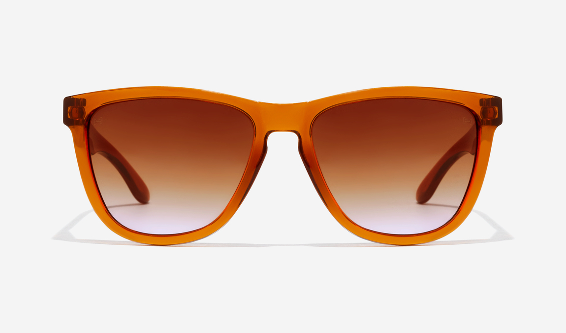 ONE es nuestro diseño más icónico de todos los tiempos. Este modelo, de la colección Made in Spain, combina montura pulida color caramelo transparente y lentes marrones degradadas a sutil lila claro.