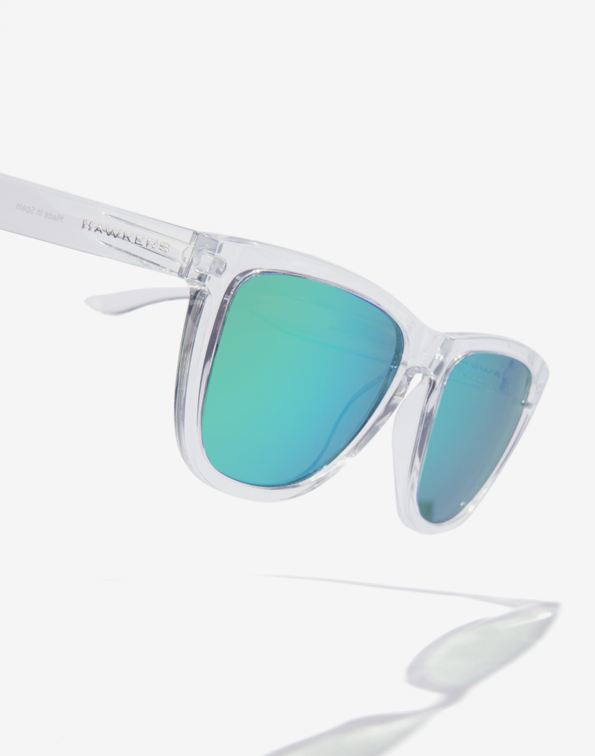 ONE es nuestro diseño más icónico de todos los tiempos. Este modelo, de la colección Made in Spain, tiene una montura transparente brillante con logos plateados en las patillas y lentes POLARIZADAS espejadas de color verde esmeralda con efecto iridiscente.
