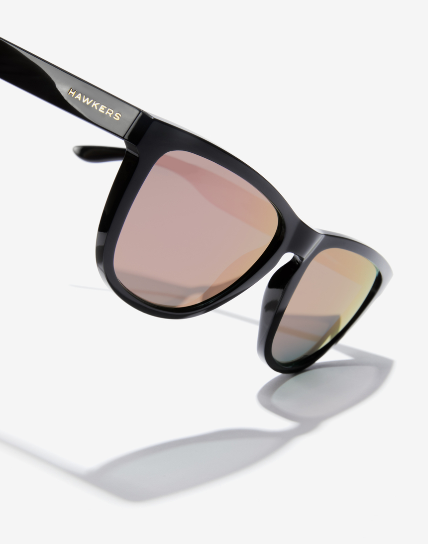 ONE es nuestro diseño más icónico de todos los tiempos. Este modelo, de la colección Made in Spain, tiene una montura negra brillante con logotipos dorados en las patillas y lentes POLARIZADAS espejadas de color oro rosa.
