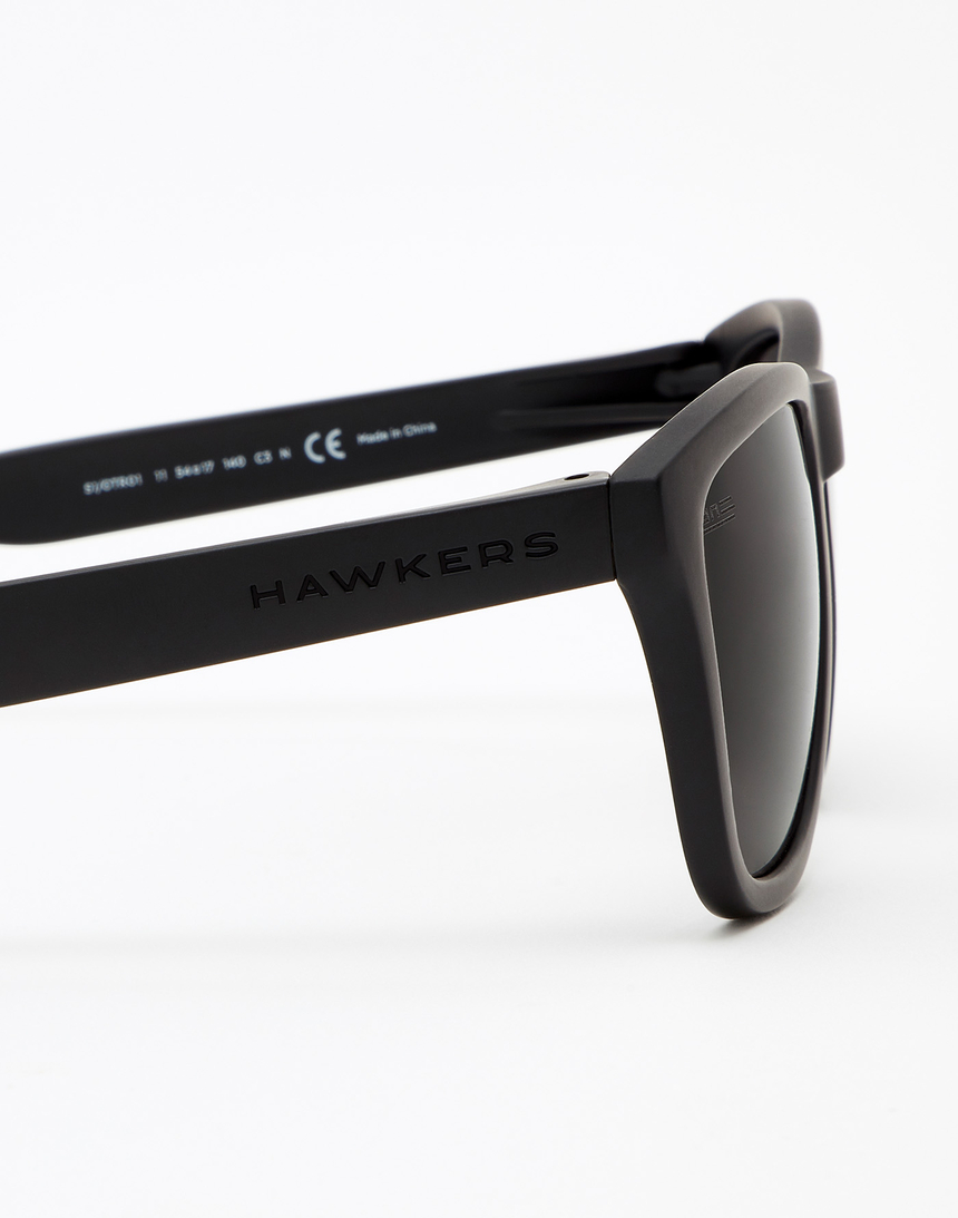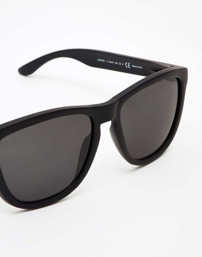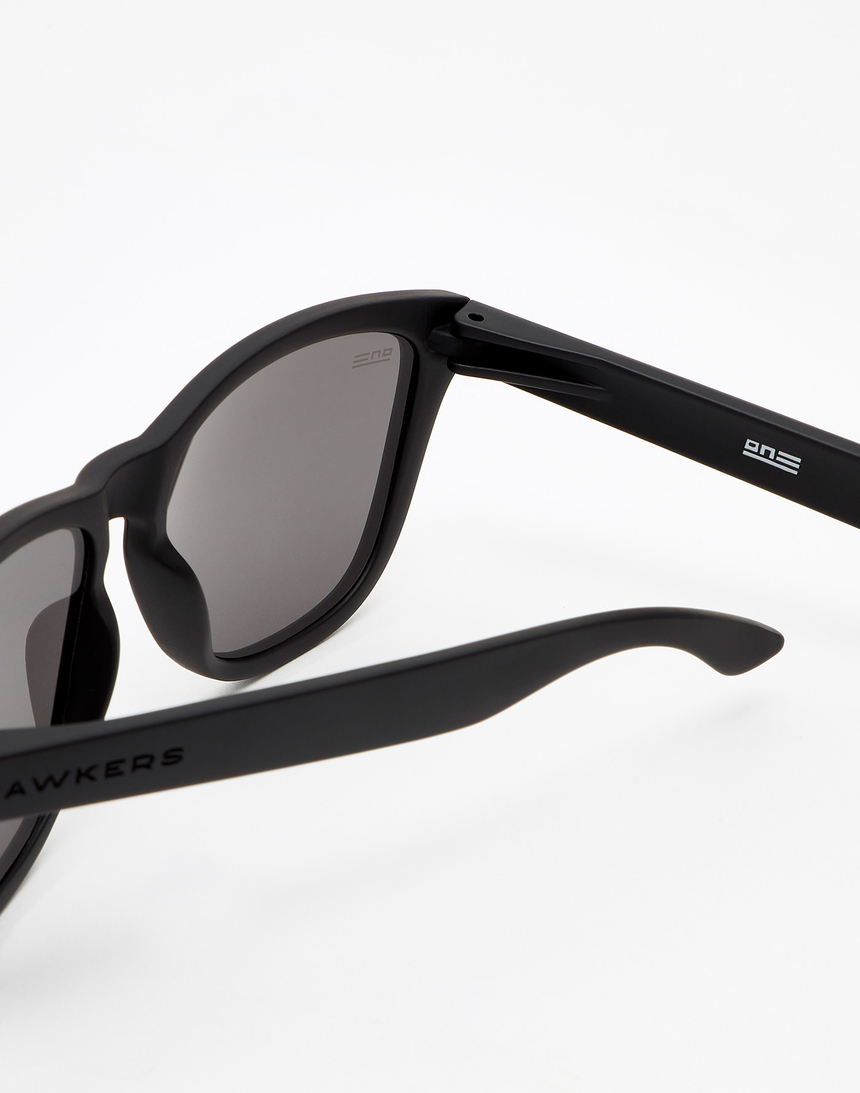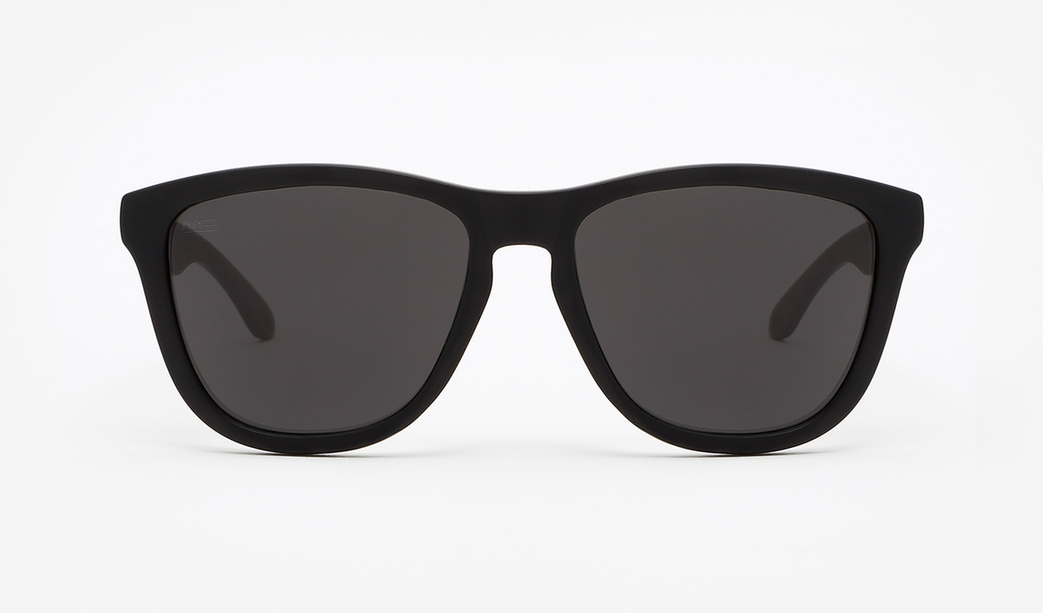 Montura negra en acabado mate y lentes negras de Nylon de alto rendimiento óptico.