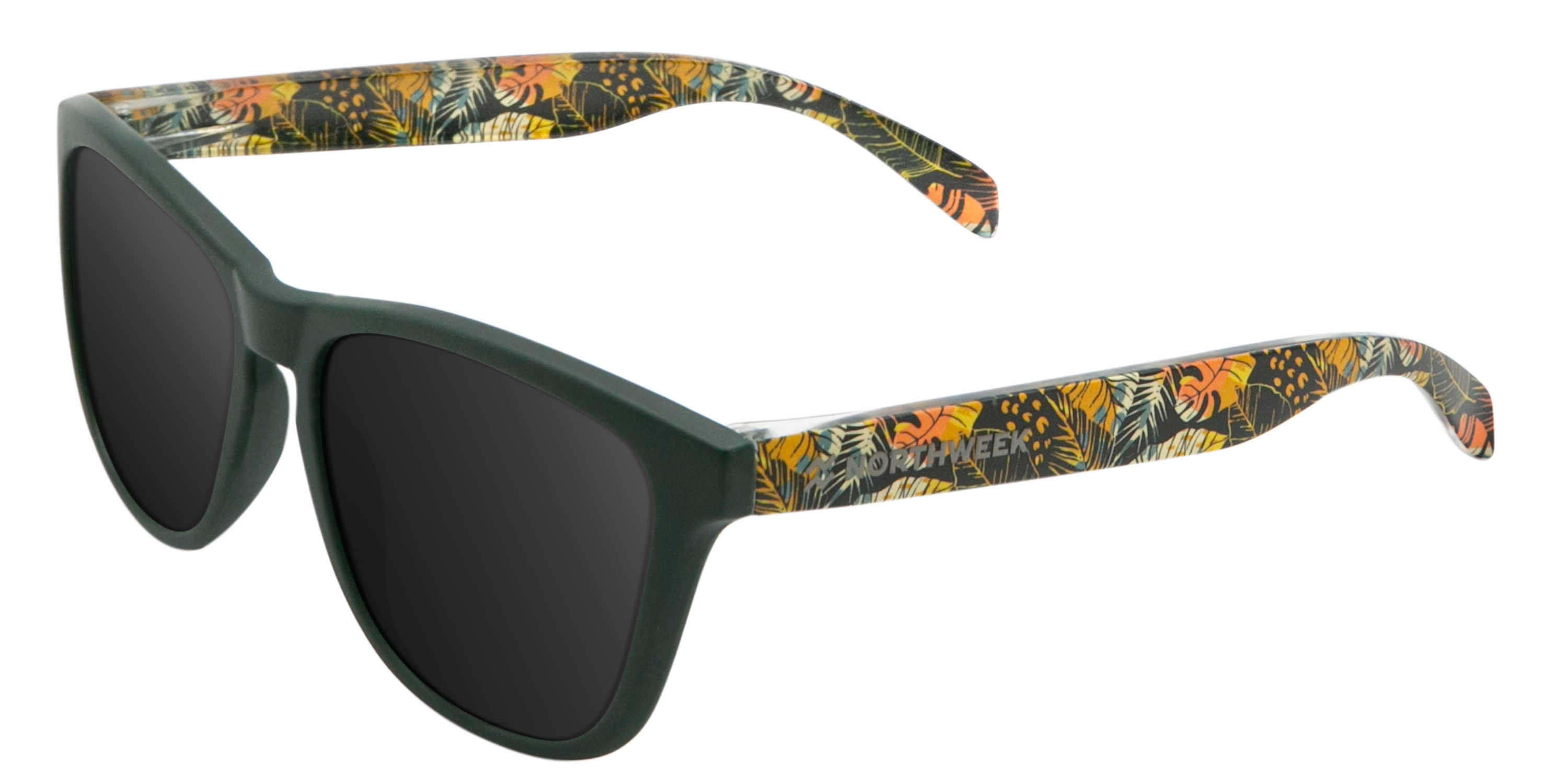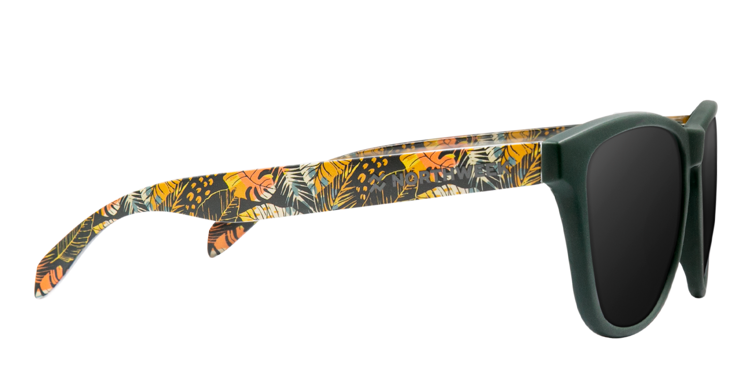 El modelo Caladlo combina montura frontal negra en acabado mate, patillas con estampado tropical y lentes polarizadas negras. ¡Deja que su energía positiva fluya en todos tus outfits!