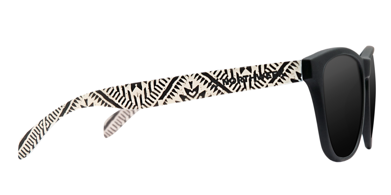 El modelo Arty combina montura frontal negra en acabado mate, patillas con estampado étnico y lentes polarizadas negro espejado. ¡Deja que su energía positiva fluya en todos tus outfits!